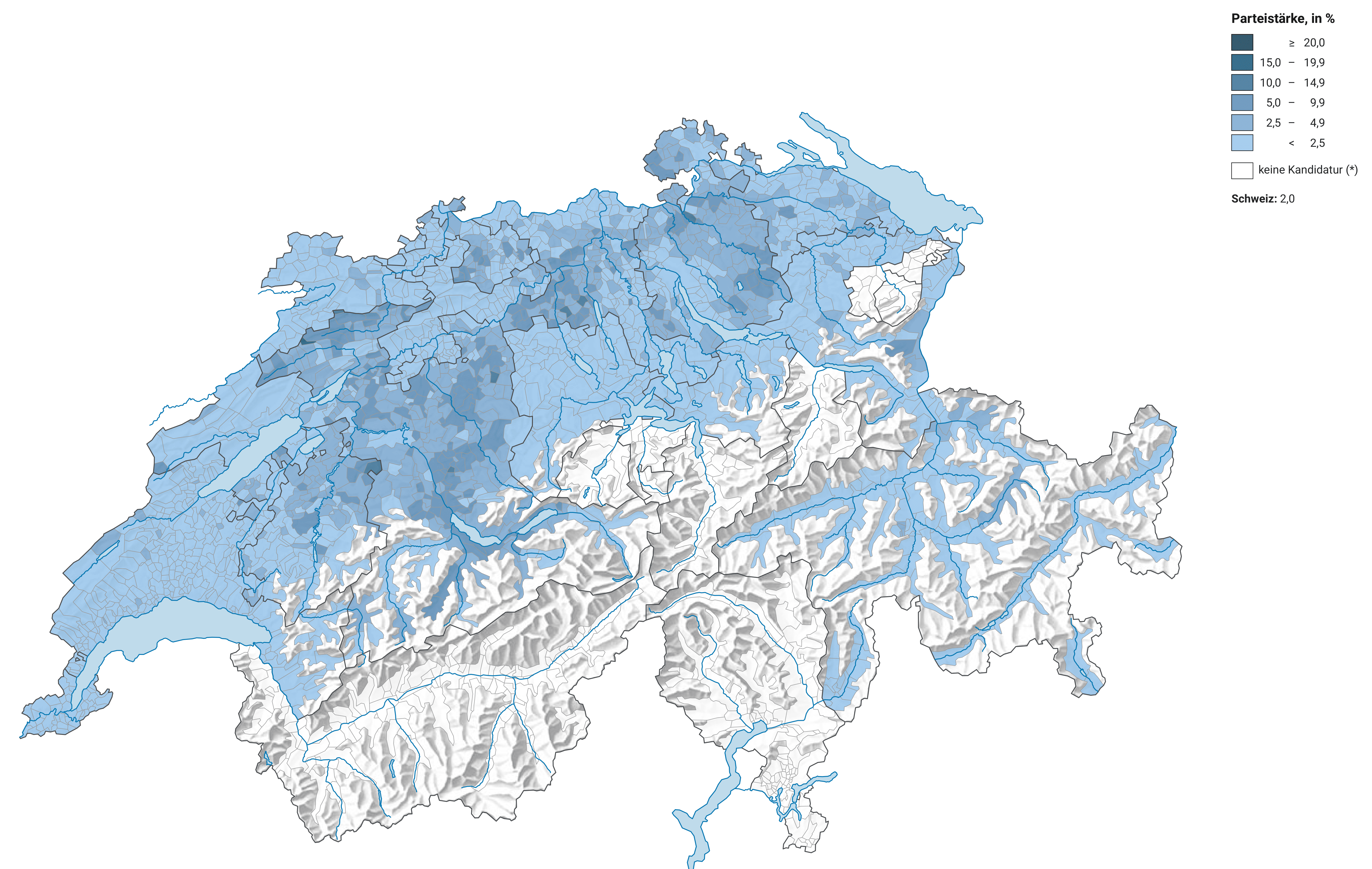 Die Grafik stellt den EVP-Wähleranteil in den Schweizer Gemeinden dar: Je dunkler die Farbe, desto stärker