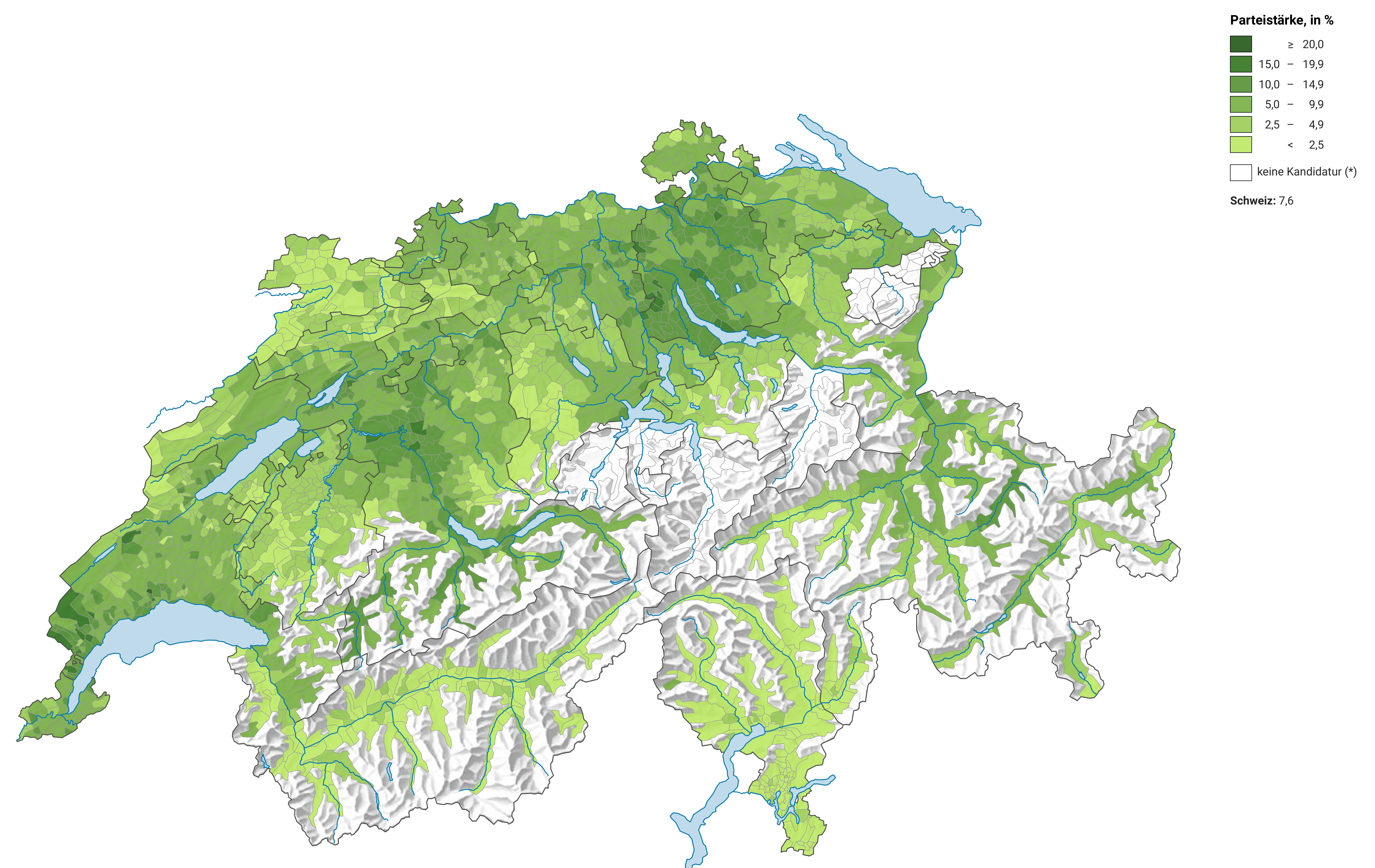 Die Grafik stellt den «glp»-Wähleranteil in den Schweizer Gemeinden dar: Je dunkler die Farbe, desto stärker