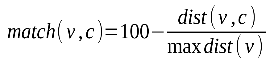 Diese Distanz wird mit der maximal möglichen Distanz (max dist) normiert (d. h. in einen Wert zwischen 0 und 100 umgerechnet) und in einen Übereinstimmungswert gegenüber dem Parteienkompass-Nutzer umgewandelt, anhand dessen die Parteien rangiert werden: